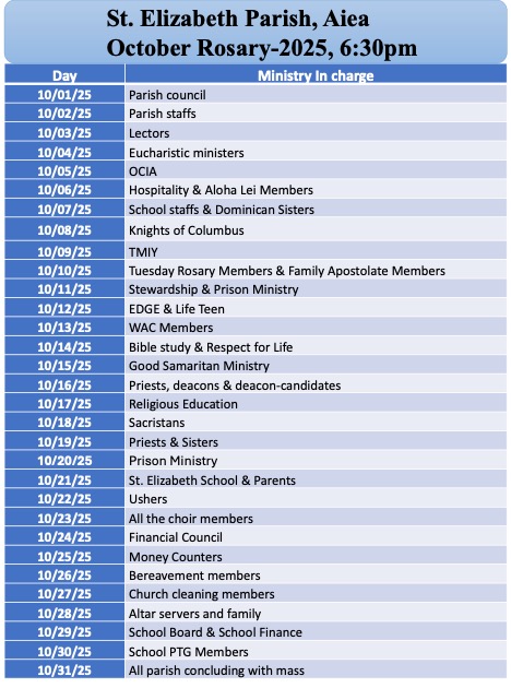 Oct 15, Wed: School Rosary at 8:15am & Parish Rosary at 6:30pm